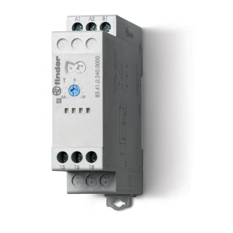 Marque: FINDER Référence: 834102400000 Description: Relais temporisé modulaire monofonction (BE) multitension 1RT 16A 24 à 240V AC/DC, 8 plages de temps de 0,05s à 10jrs, largeur 22,5mm Emballage: 5