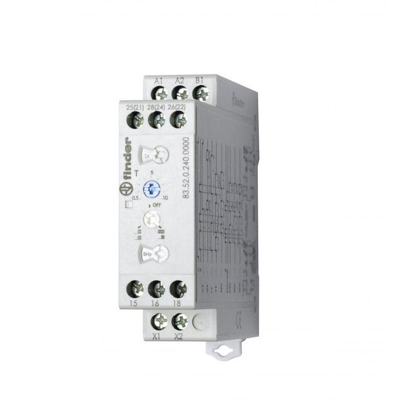 Marque: FINDER Référence: 835202400000PAS Description: Relais temporisé modulaire multifonction multitension 2RT 12A 24 à 240V AC/DC, 8 plages de temps de 0,05s à 10 jours, largeur 22,5mm Emballage: 1