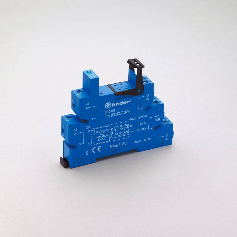 Description: Support 10A 250V 110 à 125V AC/DC, température ambiante -40° à 55°C, pour séries 4152 et 4161, de couleur bleue, étrier plastique d'extraction, bornes à cage, montage rail 35mm