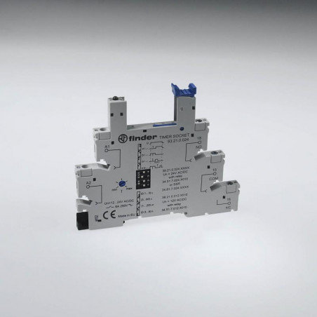 Description: Support 6A 250V 24V AC/DC, pour série 34, circuit de protection bobine et de signalisation intégré, de couleur bleue, étrier plastique d'extraction, 6,2mm, bornes à vis, montage rail 35mm
