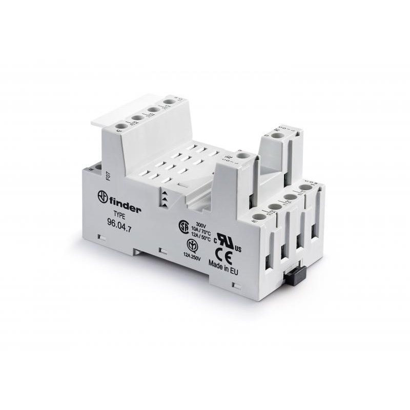 Description: Support 12A 250V, température ambiante -40° à 70°C, séries 5634, bleu, raccordement bobine et contacts séparés, étrier métallique, bornes à cage, montage sur panneau ou rail 35mm, application ferroviaire
