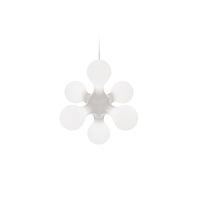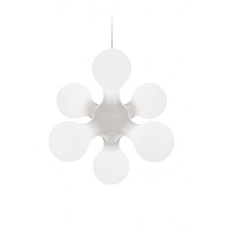 Description: Suspension avec un diffuseur en polyéthylène imprimé en rotoroulage et une structure intérieure à six luminaires placées sur des ressorts tensionnés en acier. Câble autoportant avec une âme en acier. White