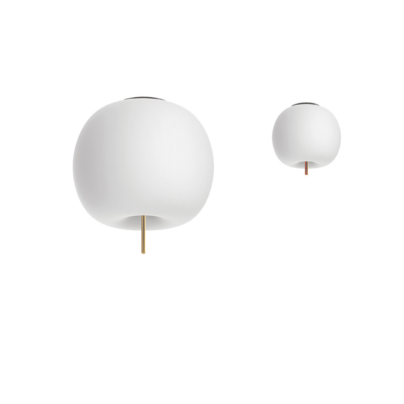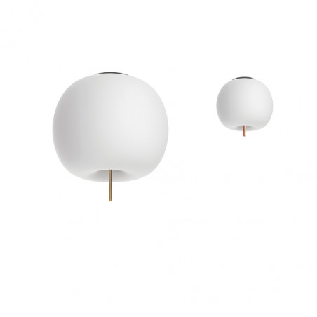 Description: Plafonnier. Diffuseur en verre opalin soufflé double couche. Corps en métal verni disponible en trois finitions: noir, cuivre et laiton. Black