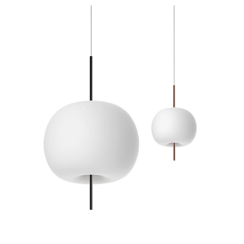 Description: Suspension au diffuseur en verre opalin soufflé double couche. Corps en métal verni disponible en trois finitions: noir, cuivre et laiton. Copper