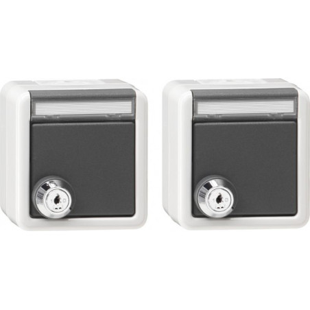 Prise SCHUKO 2x étiq. ferm.ident. Mont.app. prot.eau gris