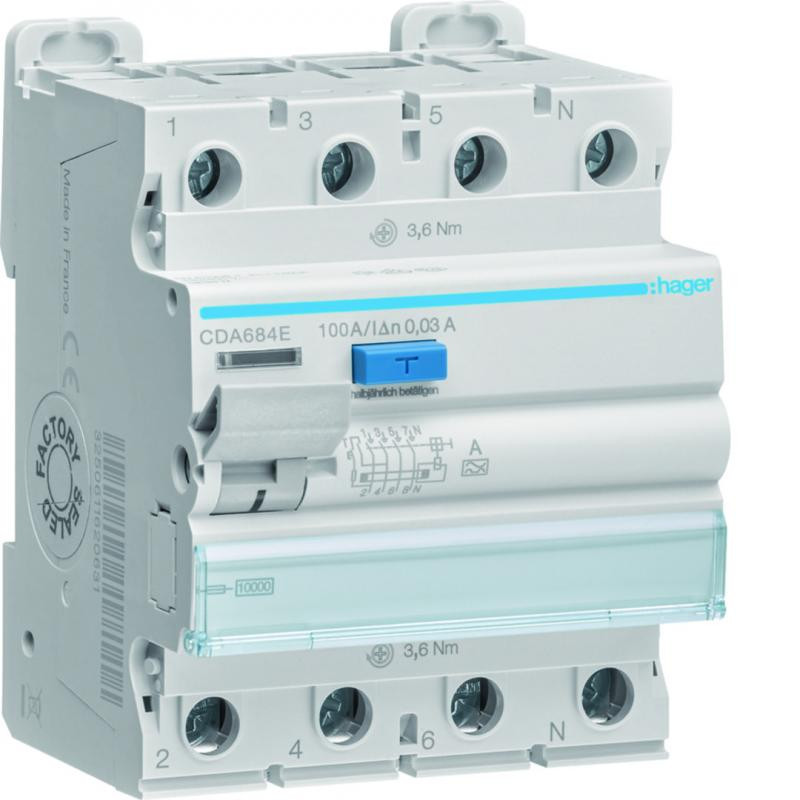 Marque: HagerRéférence: CDA684EEAN: 3250611626534Emballage: 1Description: Interrupteur différentiel. 3PN 100A 30mA type A 4MOD.