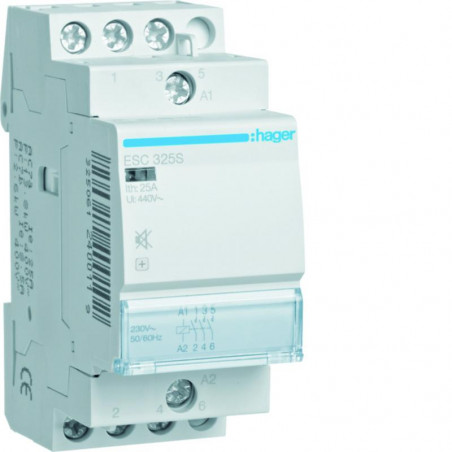 Marque: HagerRéférence: ESC325SEAN: 3250612400102Emballage: 6/6Description: Contacteur silencieux 3x25A 230V 3NO 2MOD.