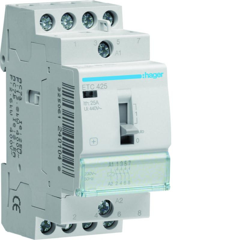 Marque: HagerRéférence: ETC425EAN: 3250612401048Emballage: 6/6Description: Contacteur J/N 4x25A 230V 4NO 2MOD.