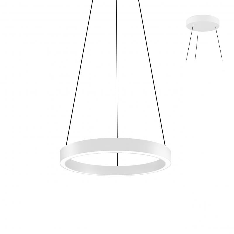 Suspension circulaire.Diffuseur opalin.3CCT 3000K, 3500K ou 4000K.Avec câbles de suspension blancs réglables 2,5m max. Patère ronde pour montage en saillie.Convertisseur dimmable DALI intégré.Panneau acoustique dispo en accessoire.