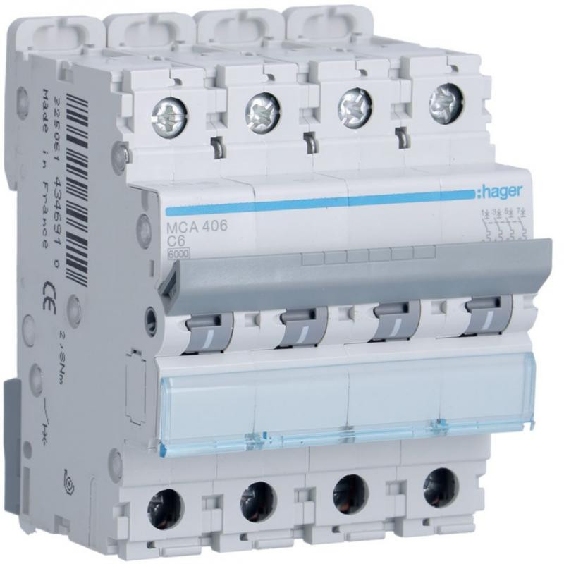 Marque: HagerRéférence: MCA406EAN: 3250614346910Emballage: 3/3Description: Disjoncteur 6kA - C - 4P - 6A - 4MOD.