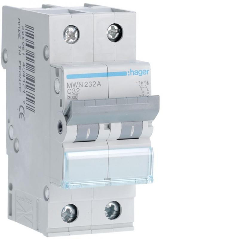Marque: HagerRéférence: MWN232AEAN: 3250614341717Emballage: 6/6Description: Disjoncteur 3kA - C - 2P - 32A - 2MOD.