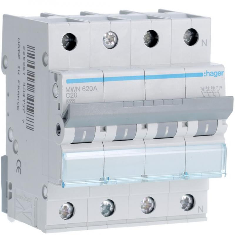 Marque: HagerRéférence: MWN620AEAN: 3250614341977Emballage: 3/3Description: Disjoncteur 3kA - C - 3P+N - 20A - 4MOD.