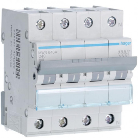 Marque: HagerRéférence: MWN640AEAN: 3250614342004Emballage: 3/3Description: Disjoncteur 3kA - C - 3P+N - 40A - 4MOD.