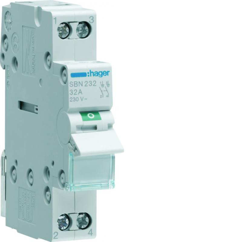 Marque: HagerRéférence: SBN232EAN: 3250615510136Emballage: 1Description: Interrupteur modulaire 2 pôles 32A