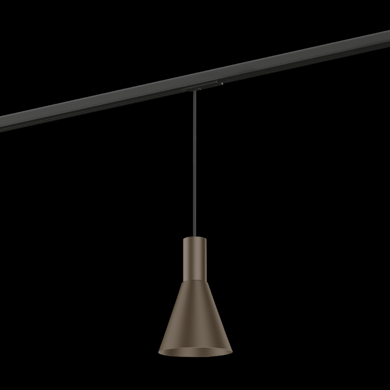 Luminaire suspendu pour rails dalimentation monophasés en aluminium moulé sous pression adaptateur de rail avec système de câble réglable en hauteur surface en Bronze Brushed peinture humide structure de surface mate RAL 9011 culot GU10 type de