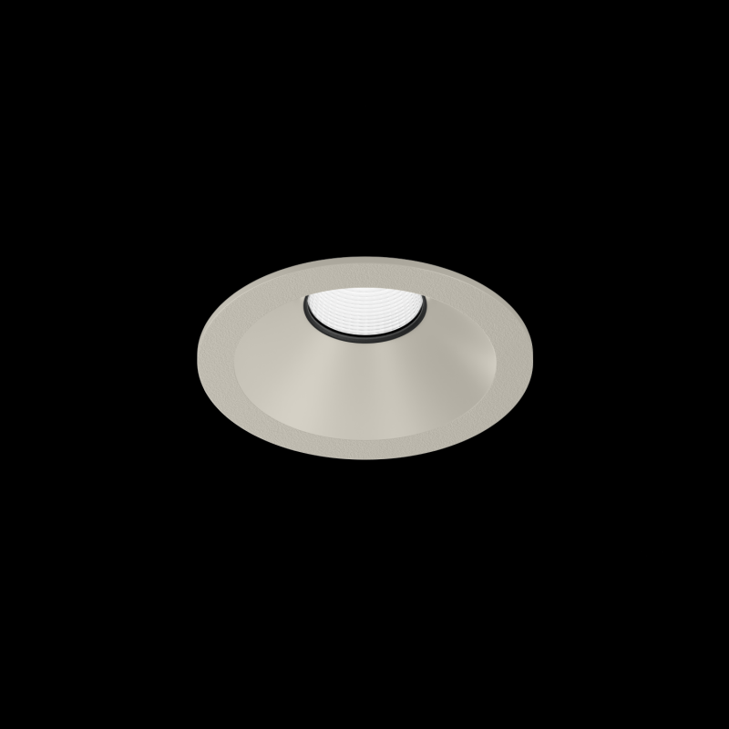 Downlight rond encastré dans le plafond en ASA surface Gris-Soie imprimé en 3D par IQ LUX montage sans outil au moyen de ressorts à lames convient pour une épaisseur de plafond de min. 8 mm profondeur dencastrement 85 mm angle de diffusion 4