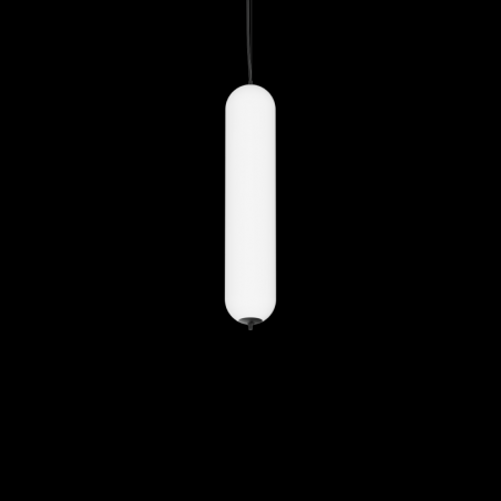 Luminaire suspendu en forme de capsule allongée, fabriqué en polyéthylène opale extrémités arrondies en aluminium en noir suspension verticale ou horizontale avec suspension de câble max. 2500 mm couleur de lumière équipement Tunable White 2700