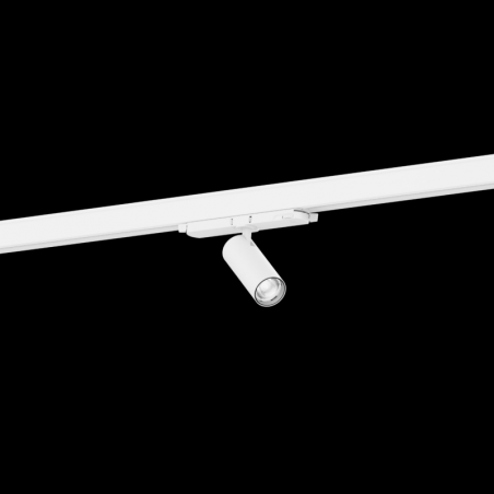 Spot en aluminium moulé sous pression rail triphasé surface en Blanc mat revêtement par poudre structure de surface mate RAL 9010 avec technologie COB Chip on Board pour une efficacité maximale gradable DALI couleur de lumière 3000 K CRI