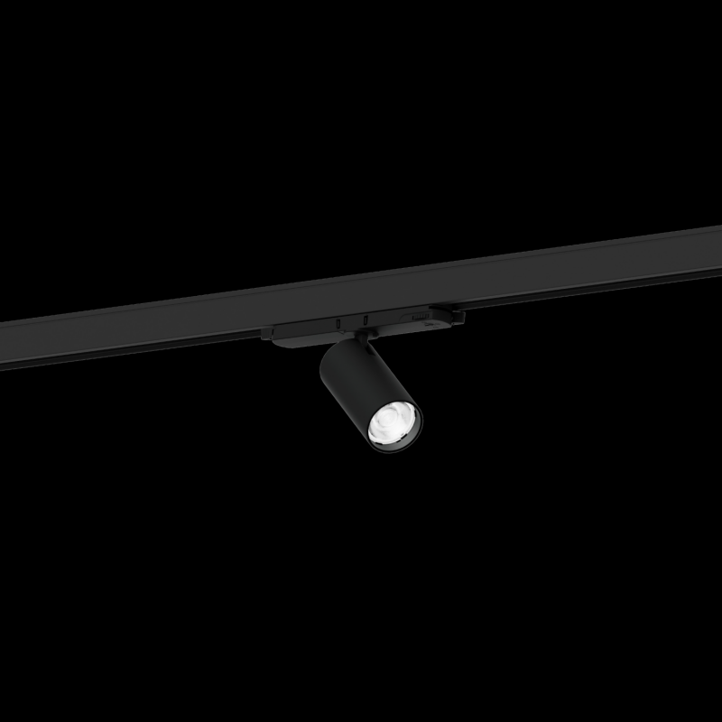 Spot en aluminium moulé sous pression rail triphasé surface en Noir mat revêtement par poudre structure de surface mate RAL 9011 avec technologie COB Chip on Board pour une efficacité maximale gradable DALI couleur de lumière 2700 K CRI