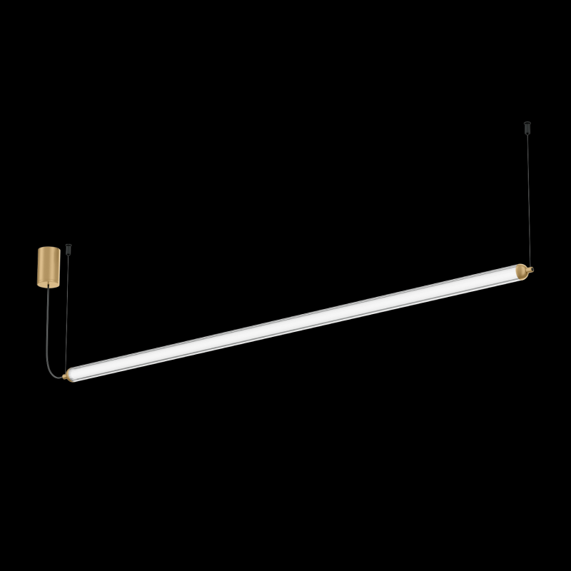 Suspension fine, orientée horizontalement, en forme de tube en verre nervuré embouts en aluminium en Champagne avec suspension de câble réglable max. 2500 mm couleur de lumière 2700 K CRI 90 IRC indice de rendu des couleurs 90 24 V indice