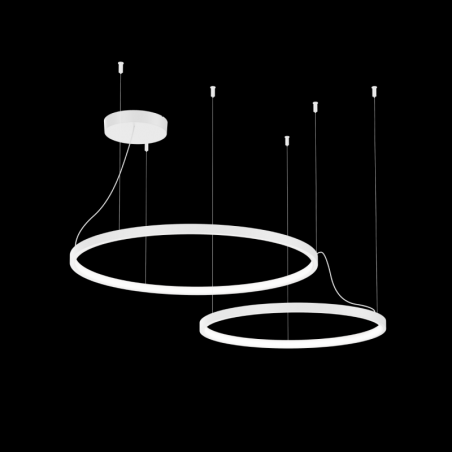 2 corps de luminaire suspendus circulaires en aluminium moulé sous pression avec suspension de câble réglable max. 4000 mm et cache-piton en blanc pur surface blanc mat revêtement par poudre , structure de surface mate RAL 9010 couvercle en