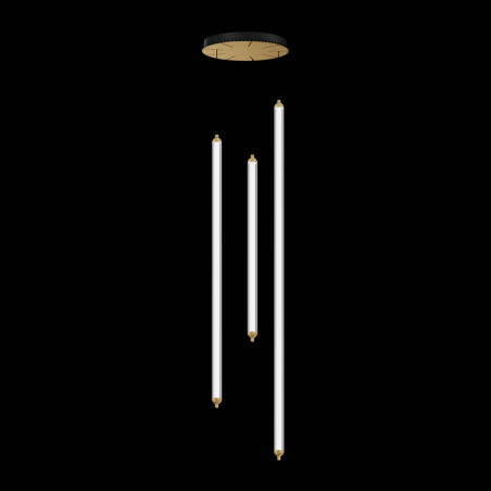 Suspension fine, orientée verticalement, en forme de tube en verre nervuré embouts en aluminium en Noir mat Champagne 3 luminaires avec suspension de câble réglable max. 2500 mm couleur de lumière 2700 K CRI 90 IRC indice de rendu des coul