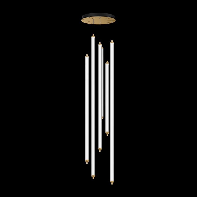 Suspension fine, orientée verticalement, en forme de tube en verre nervuré embouts en aluminium en Noir mat Champagne 6 luminaires avec suspension de câble réglable max. 2500 mm couleur de lumière 2700 K CRI 90 IRC indice de rendu des coul