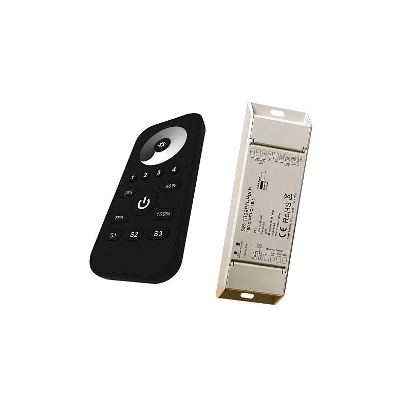 Commande sans fil RF pour bandeaux led monocolor. Kit complete avec emetteur SR2819SDIM et controleur SR1009PD. Max 4 zones, par zone un controleur SR1009PD est neccessaire. Telecommande alimente avec 3 piles AAA. (non fourni)