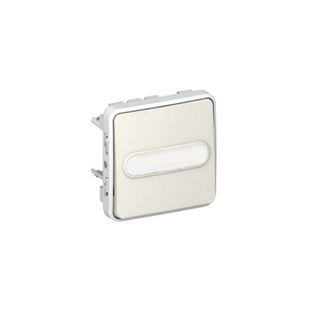 Description: PLEXO composable poussoir NO lumineux avec porte-etiquette - 10 A - blanc - IP 55 - IK 07 - avec bornes automatiques - livre avec lampe 12 V